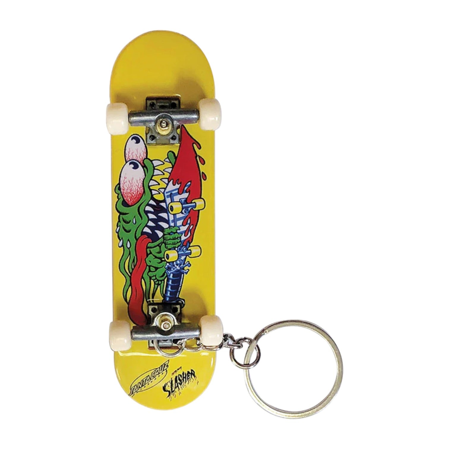 Popsicle stick shaped fingerboard keychain with Slasher logo print on bottom board, moving trucks and wheels and split ring keychain. 3 3/4" x 1